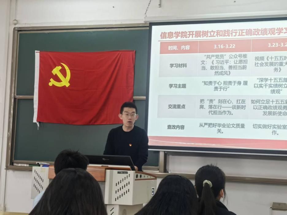 会议严格落实“第一议题”学习制度,围绕习近平总书记关于树立和践行正确政绩观的重要论述开展专题学习,由四名学生党支部书记依次领读领学材料,深入领会其核心要义与实践要求,推动理论学习入脑入心、落地见效。